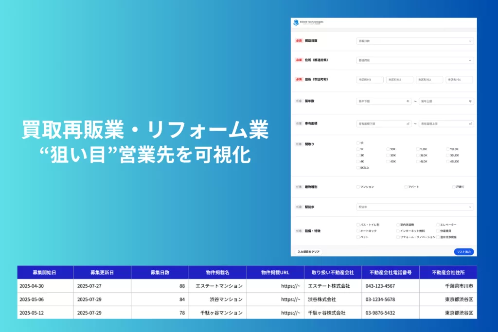 買取再販業・リフォーム業の“狙い目”営業先を可視化、営業の効率化と利益成長を支援する「長期空室・販売中物件リスト出力システム」の提供開始
