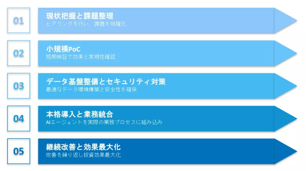 まずは、依頼企業様の現状把握と課題整理を行い、小規模なPoCを通じて効果を確認。その後の本格導入に向けたデータ基盤整備やセキュリティ対策までを一気通貫して支援します。